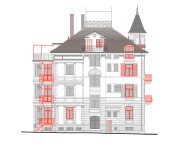 Durch die Gesamtsanierung erfährt das Gebäude eine Modernisierung hinsichtlich Gebäudetechnik und Nutzung. Die Gebäudehülle wird energetisch ertüchtigt, wobei die historisch wertvollen Fenster erhalten und fachmännisch aufgedoppelt werden. Mit der Freilegung der Natursteinelemente und inspiriert durch frühere Farbgebungen wird die Fassade neu gestaltet.