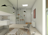 Durch den Anbau werden die beiden Geschosse räumlich und funktional zusammengebunden. Im vormals als Garage und Werkraum genutzten Erdgeschoss befindet sich neu der Wohnbereich der grossen Wohnung. Der überhohe Wohnraum schafft die Anbindung ans Schlafgeschoss und ist seinerseits als offener, nach Aussen orientierter Raum gestaltet.